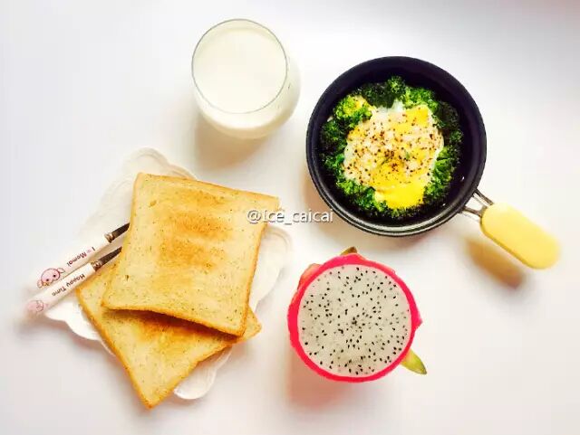 烤吐司+西兰花烘蛋+火龙果+牛奶